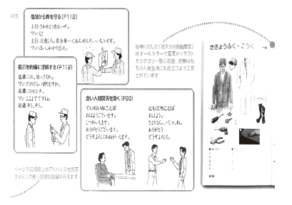 このような現場志向の体得的学習を目指し、現場のニーズに応える日本語教材として当協会では『あたらしいじっせんにほんご』を開発しました。巻末にはフルカラーのイラスト・写真付き「絵入り分類語彙表」もあります。各国
