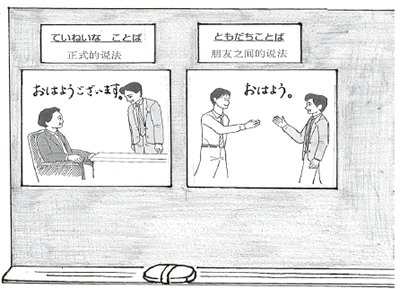 次に同様に「ていねいなことば」と言いながら翻訳語を指して、「ありがとうございます」と言って上司から何かもらっている絵を指します。「ありがとう」と言いながら同様に友達から何かもらっている絵を指します。それを繰り返し、学習者だけに言ってもらいます。数日間は黒板の端にそのままセットしておくいといいでしょう。